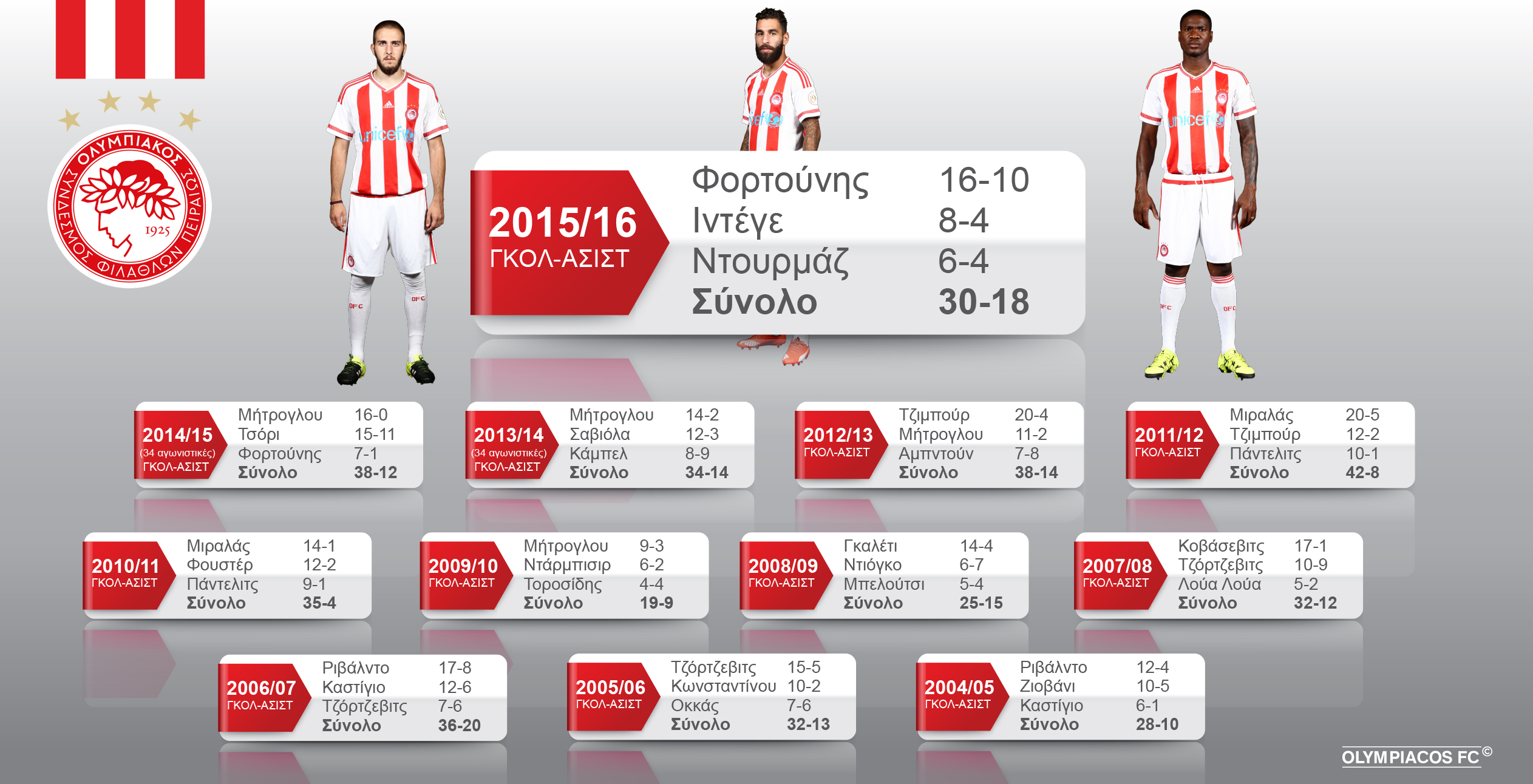 Αναμφίβολα το κορυφαίο, ως τώρα, τρίγωνο είναι αυτό που συνέθεσαν οι Ριβάλντο, Καστίγιο καιΤζόρτζεβιτς τη σεζόν 2006/07 που είχαν μαζί 36 γκολ και 20 ασίστ. Έχουν λοιπόν 4 ματς οι Φορτούνης,Ιντέγε και Ντουρμάζ για να τους πιάσουν «συμμετέχοντας» (σκοράροντας ή βγάζοντας ασίστ) σε άλλα8 γκολ και να τους ξεπεράσουν με 9 και πάνω. Μπορούν; Η απάντηση θα δοθεί στο χορτάρι.